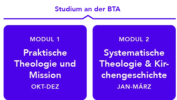 Voraussetzungen | dreijährige theologische Ausbildung an der BTA oder vergleichbarer theologischer Abschluss |