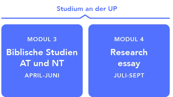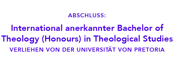 Du möchtest einen international anerkannten Bachelor in Theologie und hast bereits einen dreijährigen theologischen Ausbildungslehrgang an der BTA absolviert oder einen vergleichbaren theologischen Abschluss? Dann bieten wir dir mit den Modulen 1 und 2 von BTA.ACADEMIC die Möglichkeit für den Einstieg in den Honours-Bachelor-Studiengang der Universität von Pretoria (UP) mit den Modulen 3 und 4.