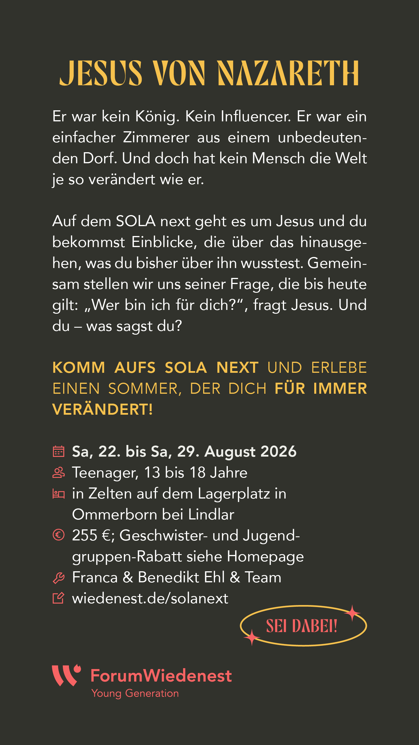 Early Bird 225 € (bis 1.1.26), danach 255 €; ab dem zweiten Kind auf dem SOLA next: 210 €, Jugendgruppen ab 5 Personen aus derselben Gemeinde: 195 € p.P. |